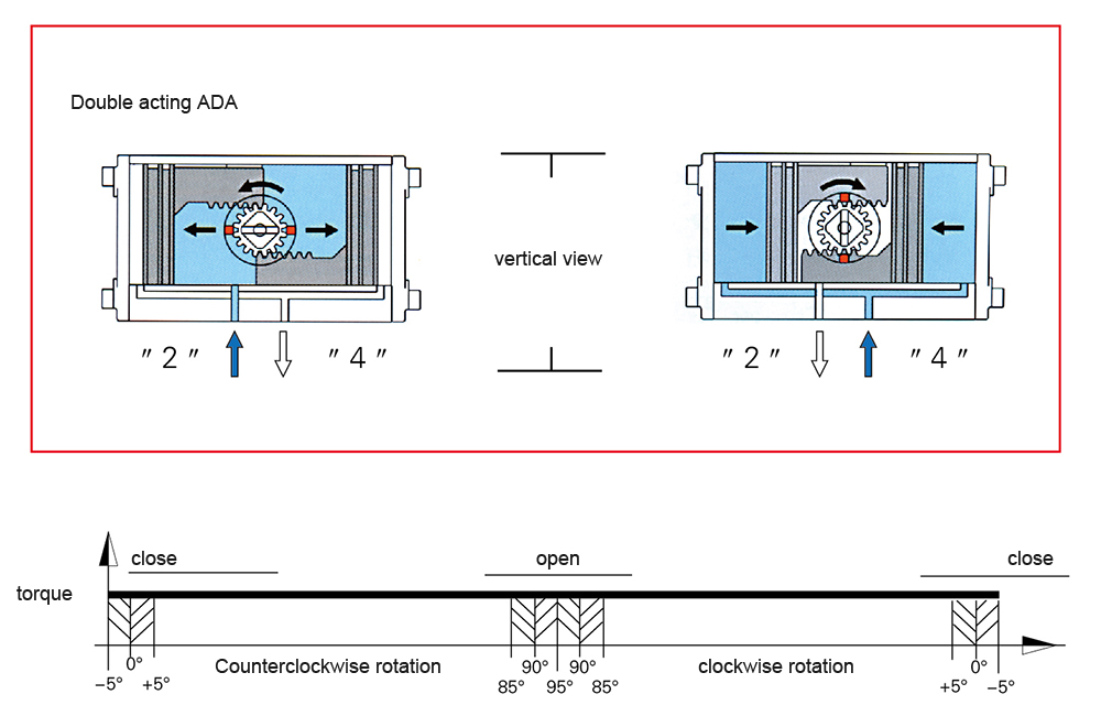 The above schematic diagram indicates that the torque value of the dual action actuator remains constant throughout the entire stroke. Users can select the appropriate actuator model based on their specific requirements and refer to the following content: