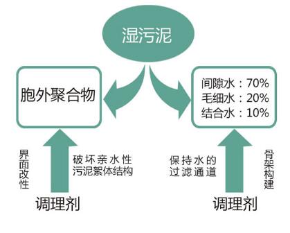 污泥改性调理主要是对污泥颗粒表面的有机物进行改性,破坏污泥的细胞和胶体结构,改变污泥的水分结合状态,同时降低污泥的压塑性,使污泥能满足深度脱水干化处理的要求。